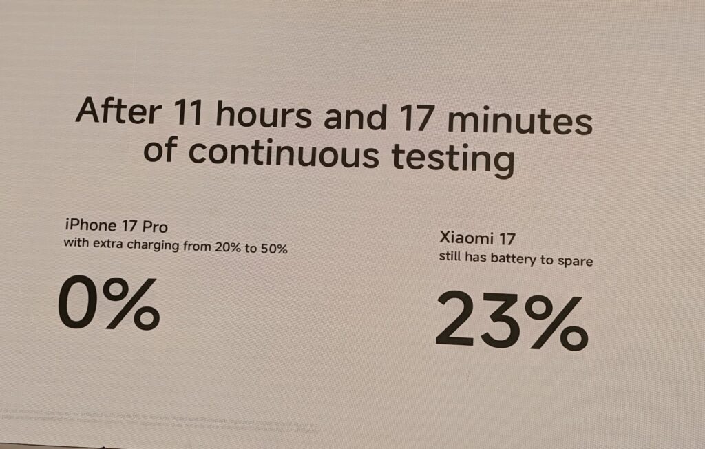 Erick Aguilera,PR Manager de Xiaomi Latam,presentó un video en el que se observa cómo someten a prueba al iPhone 17 Pro frente al Xiaomi 17 respecto al uso de la batería. Con el mismo uso,el teléfono de la manzana quedó en 0% de batería,aun cuando le recargaron del 20% al 50% en la misma prueba,mientras que el Xiaomi 17 con una sola carga de batería conservó el 23% de la misma.