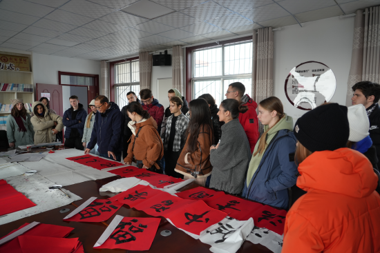 Amid the fragrance of ink and the atmosphere of prosperity, the journey began in Shibao Village. First, the foreign friends had a close encounter with the beauty of Chinese calligraphy. A calligraphy teacher explained the cultural connotations of calligraphy and the auspicious meaning of the character "福" (Fu, meaning "good fortune") in the context of traditional Chinese culture. With brush in hand, immersed in concentration and calmness, the character "福" vividly appeared on paper, capturing the fascination of the foreign friends who were eager to try their hand at it. With patient guidance from the calligraphy teacher, they started imitating the characters from the model, grasping the horizontal and vertical strokes, making Chinese characters a medium for them to gain a deeper understanding of traditional Chinese culture.
