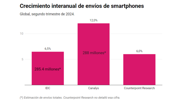 IDC pronosticó un incremento de ventas de 6.5 por ciento interanual hasta 285.4 millones de unidades. Para Counterpoint Research el aumento fue del 6 por ciento. En tanto,Canalys identificó un alza del 12 por ciento hasta 288 millones de smartphones vendidos en el mundo. El crecimiento es tendencia,pues se trata de la tercera o cuarta vez consecutiva —según la consultora que se considere— de buenas noticias