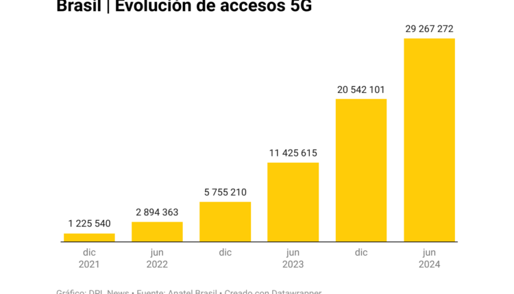 El regulador brasileño Anatel registró 29.2 millones de accesos 5G a junio de 2024.