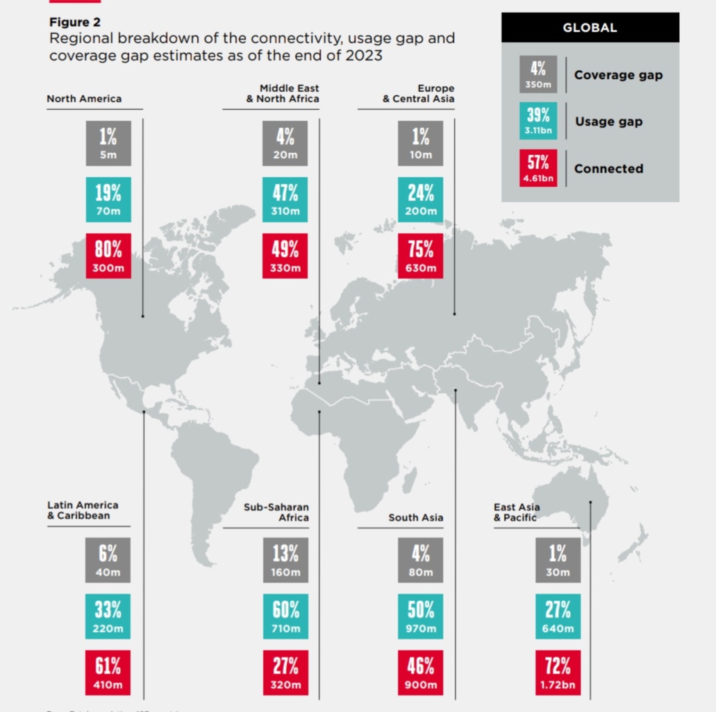 La brecha de uso es más profunda en algunas regiones del mundo. En especial,en África Subsahariana,60 por ciento de quienes todavía no acceden a Internet móvil viven en zonas de cobertura. Además,la brecha de uso es de 50 por ciento en el sur de Asia,y de 47 por ciento en el Medio Oriente y el Norte de África.