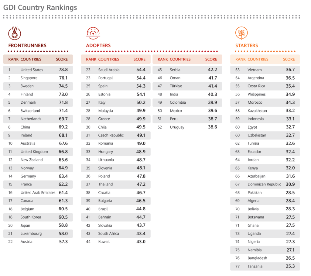 El Índice clasifica a los países en tres grupos: Pioneros,Adoptantes y Principiantes. Cada grupo requiere estrategias específicas para el crecimiento digital. Los Pioneros son economías avanzadas con infraestructuras TIC maduras,que obtienen los mayores rendimientos de la inversión en transformación digital.