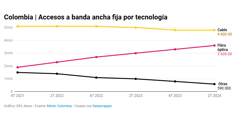 La fibra óptica sigue ganando terreno en Colombia. Se incorporaron más de 600 mil accesos a banda ancha fija bajo esta tecnología en el último año hasta 3.6 millones al segundo trimestre,equivalentes al 40 por ciento del total. Cable sigue siendo la principal forma de acceso (53.6%),entre otras tecnologías.
