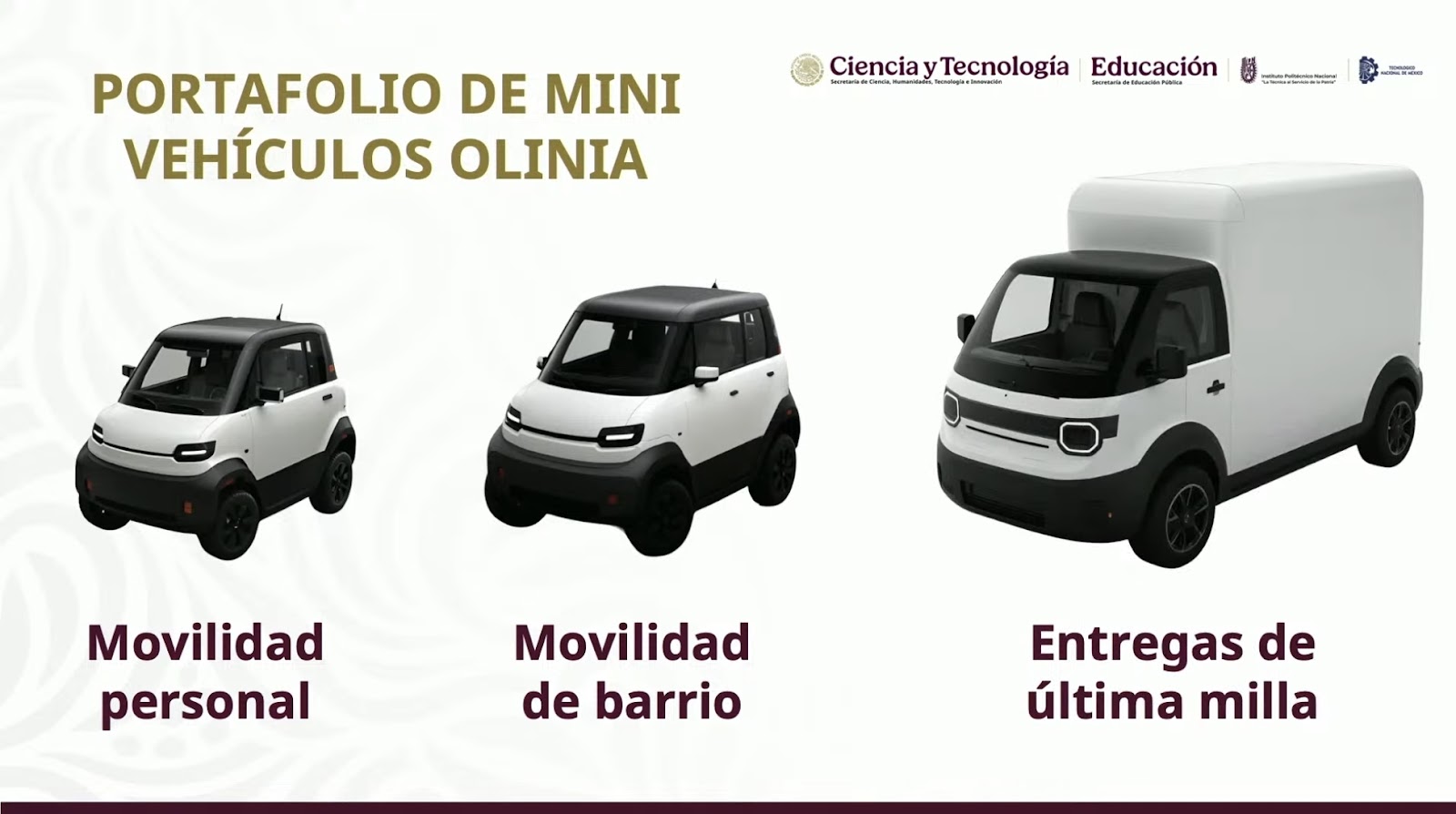 El Gobierno de México anunció la creación de una armadora de mini vehículos eléctricos llamada Olinia,que buscará que las y los mexicanos tengan acceso,de manera asequible,a estos autos.