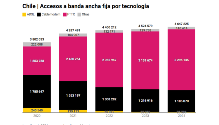 Se incrementó un 5.8 por ciento la base de abonados de banda ancha fija por fibra óptica en Chile. Hay 3.2 millones de clientes bajo esta tecnología,que representó el 70.9 por ciento de las suscripciones al tercer trimestre de 2024. La base general se incrementó un 3.1 por ciento hasta 4.6 millones.