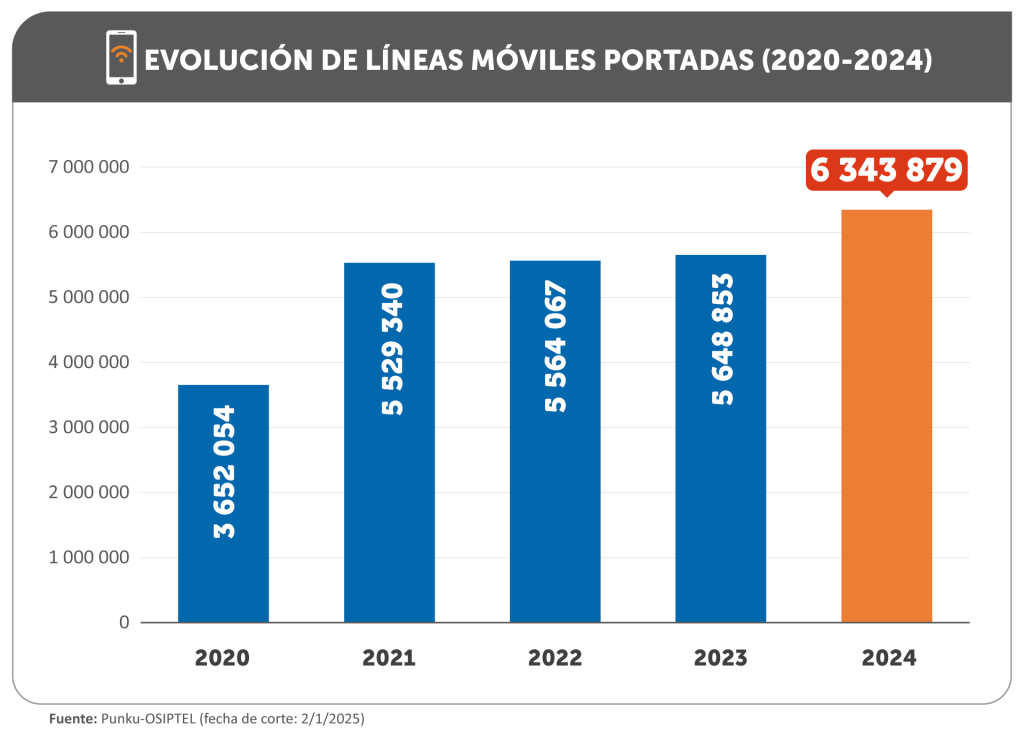 Con más de 300 mil adiciones netas en conjunto,Claro y Entel lideraron la portabilidad móvil que,con 6.3 millones,en 2024 registró un máximo en el último lustro en Perú.