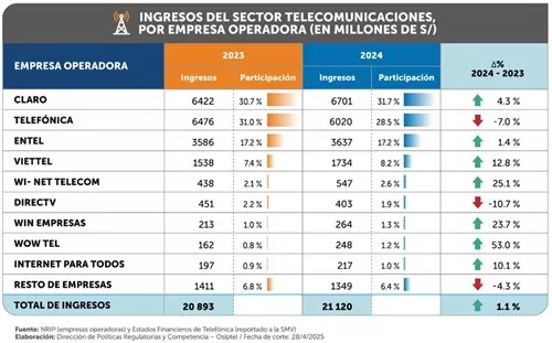 El sector de telecomunicaciones peruano en su conjunto reportó ingresos por 21 mil 120 millones de soles al cierre 2024,de acuerdo con datos del Organismo Supervisor de Inversión Privada en Telecomunicaciones (Osiptel).