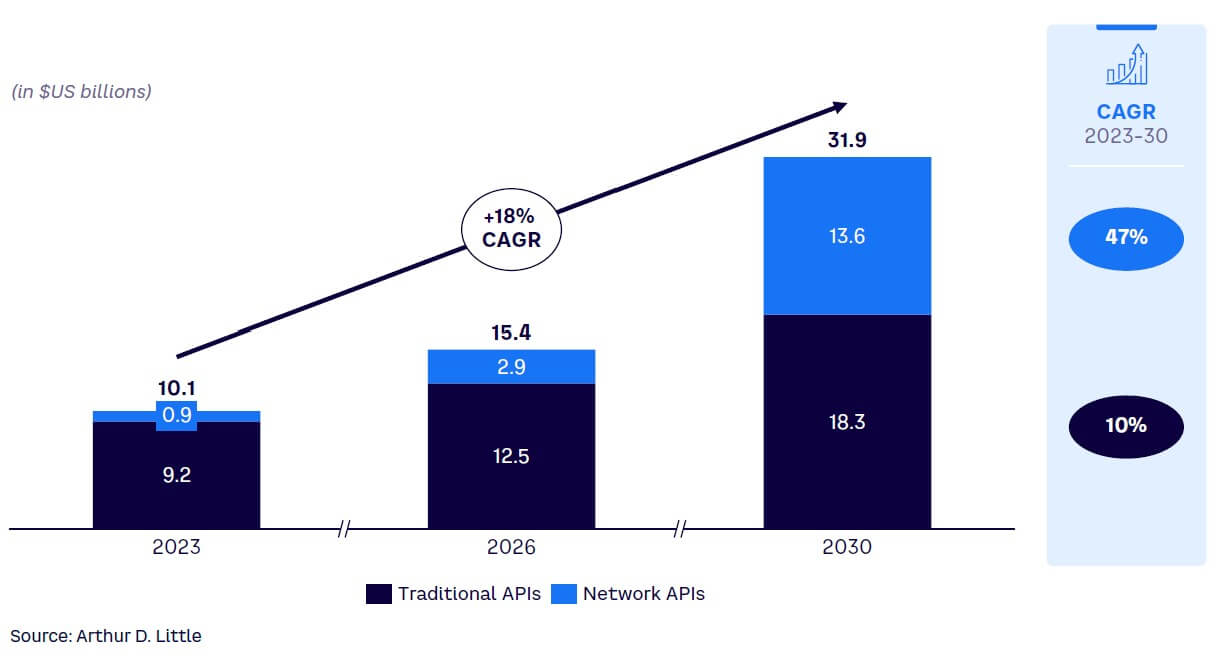 De acuerdo con Arthur D. Little,se espera que el mercado de API de red aumente a una tasa de crecimiento anual compuesta de 47% entre 2023 y 2030,llegando a 13,500 millones de dólares.