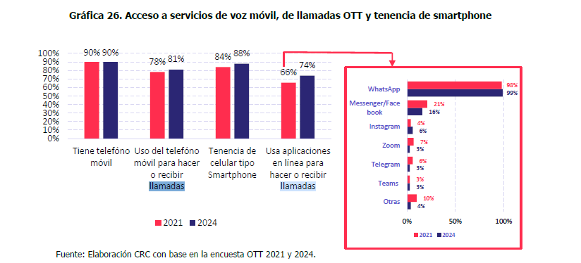 La radiografía de consumo también muestra que la tenencia de smartphones llegó al 88% en 2024 (84% en 2021),74% de los usuarios con estos dispositivos utilizan aplicaciones en línea para llamadas y 78% para mensajería,con WhatsApp como la plataforma más empleada.