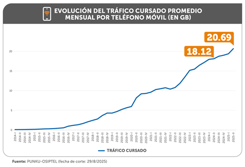 Los datos de Osiptel también indican que el consumo promedio mensual de datos de Internet móvil desde teléfonos celular se situó en 20.69 GB en el segundo trimestre,lo que representa un aumento de 14.18% respecto a 2024 (18.12 GB).